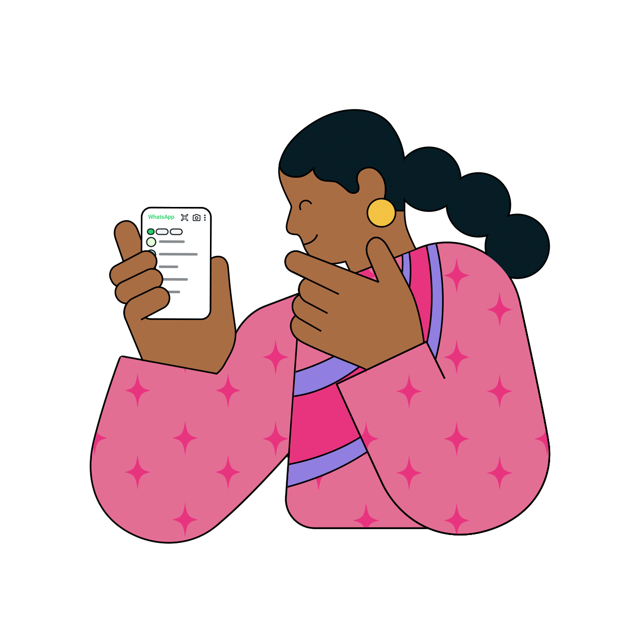 Now onto the actual spots we created! Each one highlights a specific tool or set of tools available to WhatsApp users. As the series progressed, the client became increasingly enthusiastic about the illustrations, and by the end, we had truly refined the visual style.